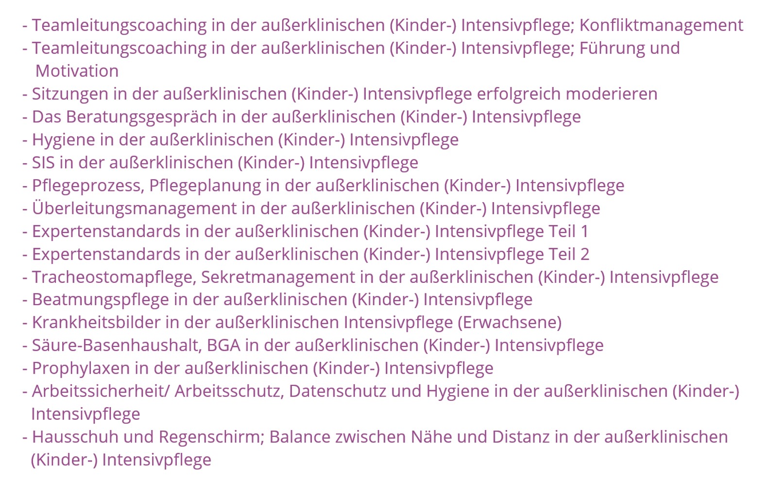 Im Rahmen der “Registrierung beruflich Pflegender” besteht in Deutschland erstmals für alle professionell Pflegenden die Möglichkeit, sich bei einer unabhängigen Registrierungsstelle zentral erfassen zu lassen. Für den Besuch meiner Seminare und Fortbildungen erhalten die Teilnehmer_Innen eine Teilnahmebestätigung und die entsprechenden Punkte.